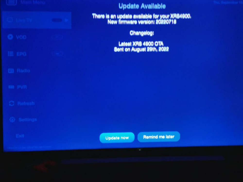 XRS4900 keeps notifying of available update , version 20220718 , OTA update sent on August 29, 2022. After download this version does not load do to error. I notice that the iptv version (5.0.748) in 20220718 is most likely older than the iptv version (5.0.765) in current loaded firmware 20220506, which may be creating the error. Can this be fixed or do we just live with the notifications until a future update? Anyone else have similar problem?