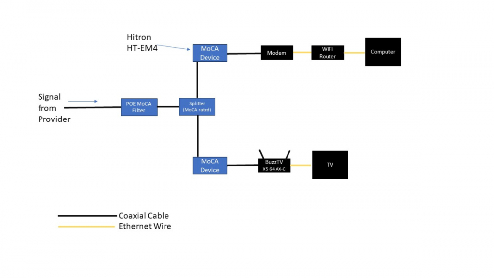 BuzzTV5 box and TV were connected by Ethernet through MoCA box.